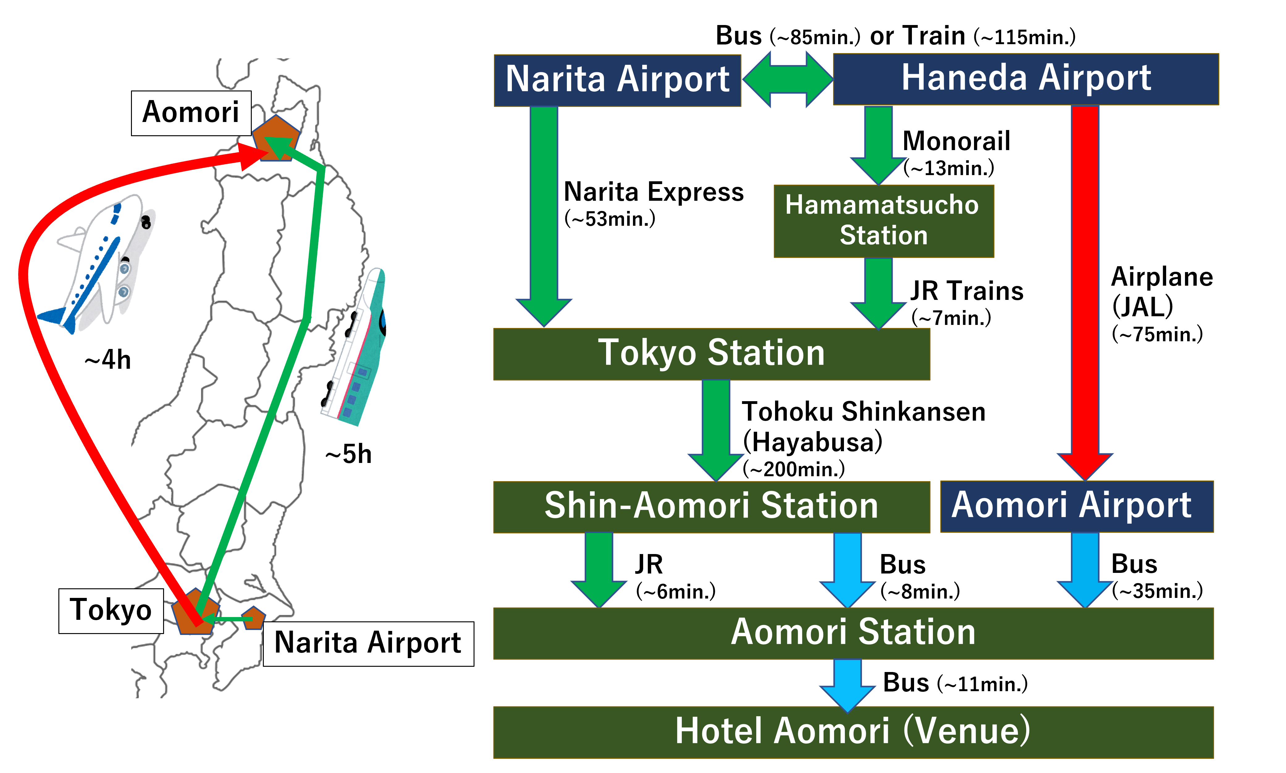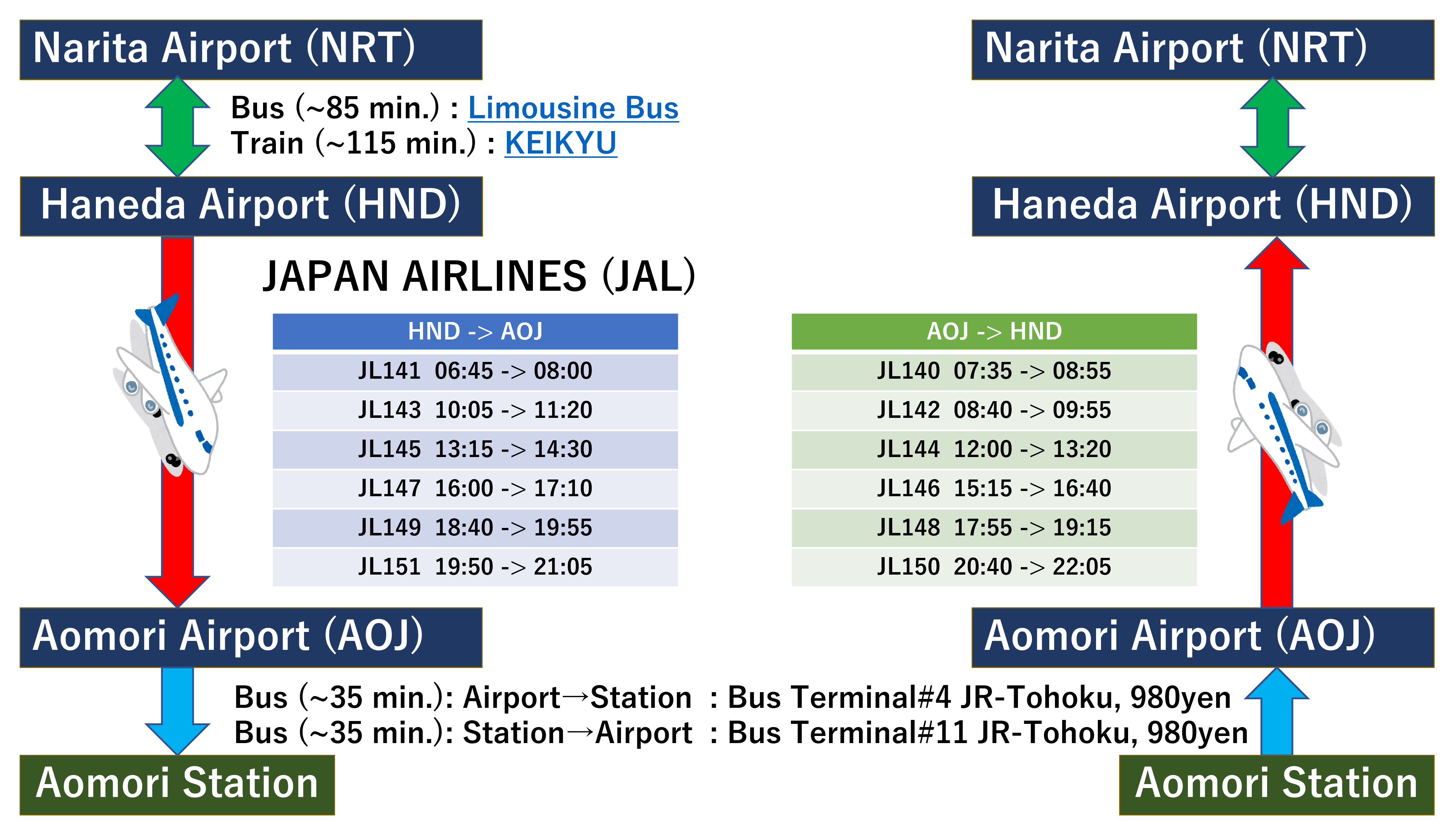 The most convenient way to reach Aomori is by flying from Tokyo’s Haneda Airport (HND) to Aomori Airport (AOJ). Japan Airlines (JAL) operates several flights per day. If your international flight arrives at Haneda, transferring to a domestic flight is simple and requires little time. However, if you arrive at Narita Airport (NRT), you will need to travel to Haneda by bus or train. A minimum of three hours is normally required for the transfer from Narita to Haneda. Please note that it may take longer depending on immigration and customs procedures, so check with your airline and allow plenty of time.