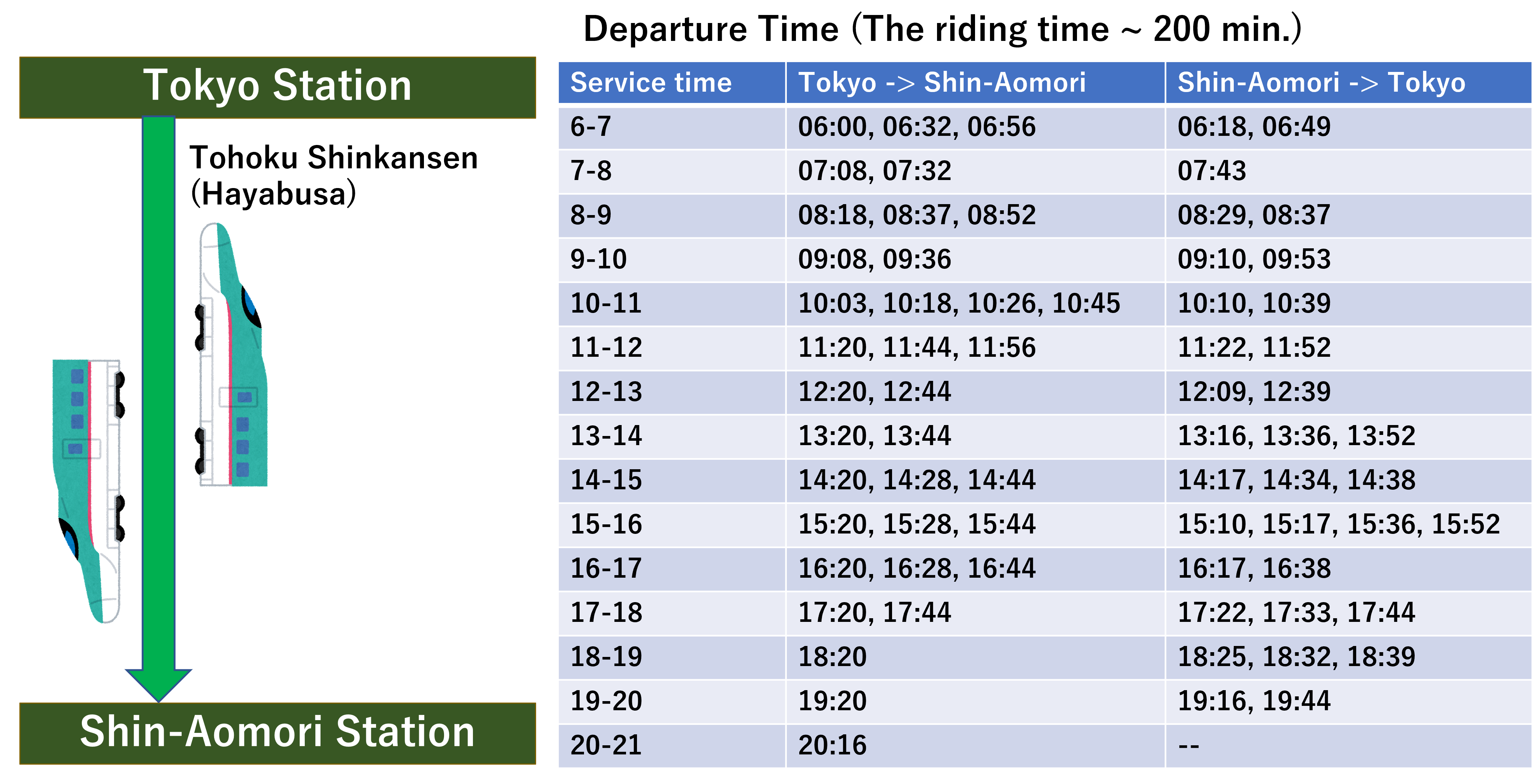 You can also take the Hayabusa service on the JR Tohoku Shinkansen from Tokyo to Shin-Aomori (approximately 3.5 hours) and transfer to a local train to Aomori Station (5 minutes). The total one-way travel time is around 4 hours. Seat reservations are mandatory on all Hayabusa trains.